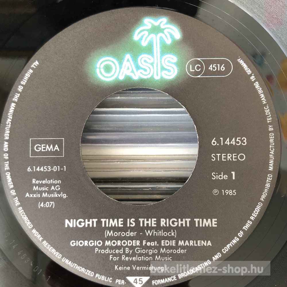 Giorgio Moroder Featuring Edie Marlena - Night Time Is The Right Time bakelit lemezGiorgio Moroder Featuring Edie Marlena - Night Time Is The Right Time - Oasis 6.14453 AC bakelit (vinyl) hanglemez 0000000000000